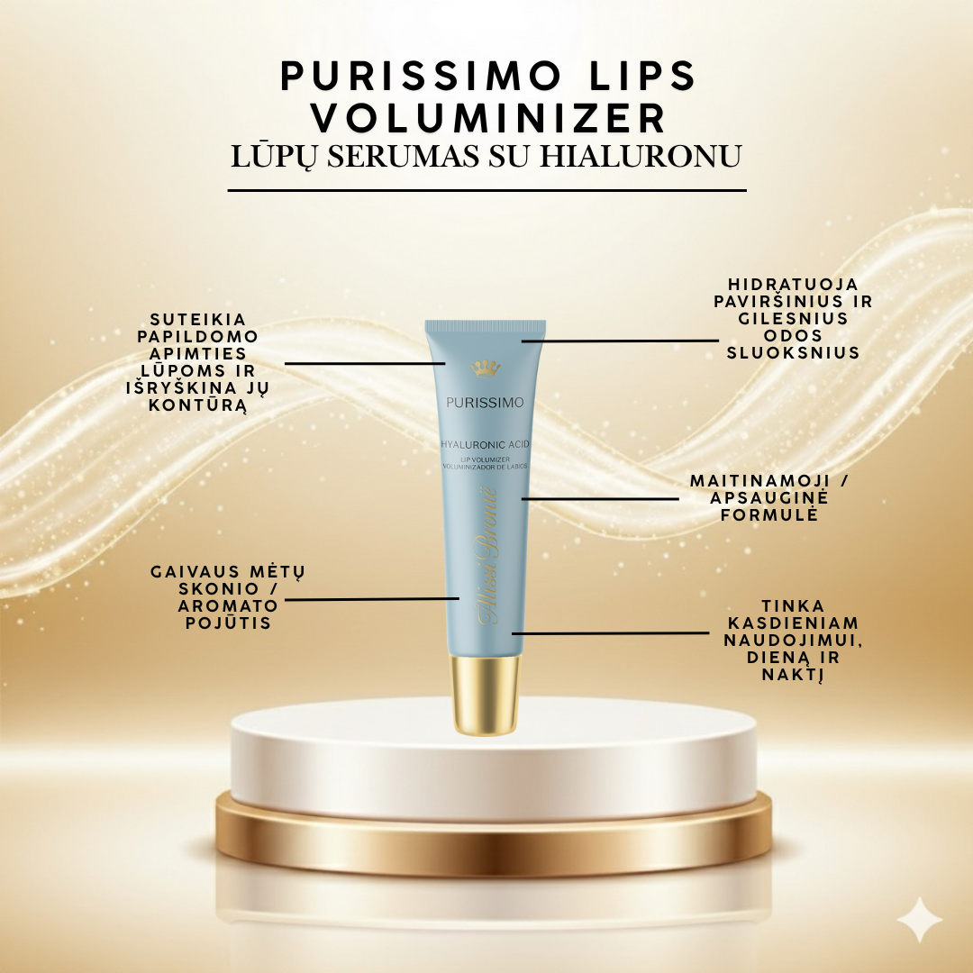 Jauninantis lūpų serumas su hialuronu – natūralus putlinimas ir raukšlelių mažinimas Tobula priežiūra lūpoms ir jų kontūrui. Aukštos grynumo hialurono rūgštis drėkina, vizualiai padidina apimtį, užpildo smulkias raukšleles ir suteikia lūpoms švytėjimo bei minkštumo. Puikiai tinka naudoti kasdien, vienas arba prieš lūpų dažus.